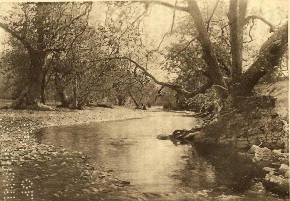 After the winter rains had set in, and the grass had grown to a height of three or four inches, herding became easy, for they quietly filled themselves; but at this time, just before the rain, when not a green leaf is to be seen, when the dead summer vegetation is parched and crumpled into dust and fragments of sterns, the sheep are always hungry and unmanageable; but when full of green grass the entire flock moves as one mild, bland, contented animal. This year the winter rains did not set in until the middle of December. Then Dry Creek became a full, deep, stately flowing river; every hollow in the hills was flooded, every channel so long dry carried a rushing, gurgling, happy stream.