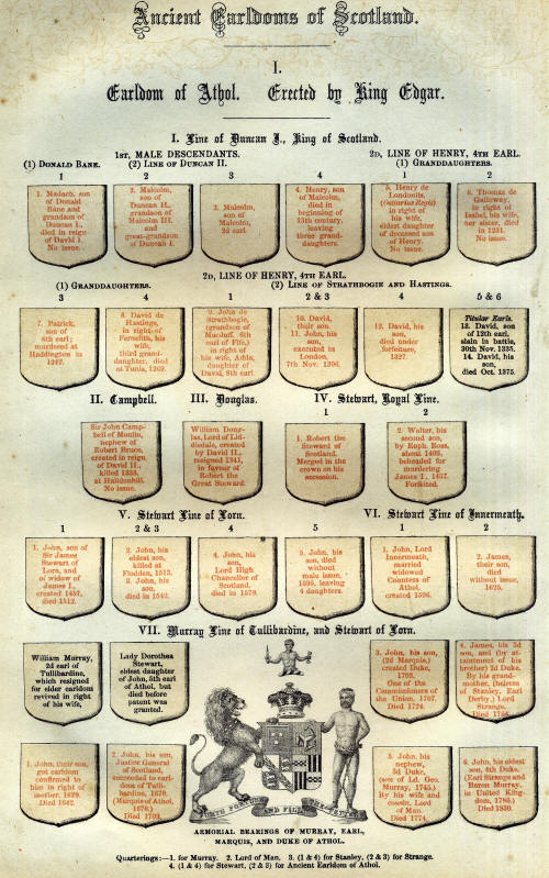 ATHOL, ATHOLL, or ATHOLE, earls of, an ancient title, formerly possessed by the royal family of Scotland, subsequently in right of marriage by Thomas de Galloway and his son, and after him by David de Hastings, afterwards by the Strathbogie family, then after being held by a Campbell and a Douglas, it was conferred on a scion of the royal house of Stewart, and through a second creation in the house of Stewart, it came latterly to be possessed by a branch of the noble family of Murray. It is the name of a mountainous and romantic district in the north of Perthshire, which, from a remote period, has preserved its boundaries unaltered. It was the original patrimony of the family which gave kings to Scotland from Duncan to Alexander the Third; and it is the earliest district in Scotland mentioned in history. The name signifies ‘pleasant land,’ and Blair of Athol, its principal valley, ‘the field or vale of Athol.’ "Its chief interest, says Skene, "arises from the strong presumption which exists that the family which gave a long line of kings to Scotland, from the eleventh to the fourteenth century, took their origin from this district, to which they can be traced before the marriage of their ancestor with the daughter of Malcolm the Second raised them to the throne." (History of the Highlanders, vol. II. p. 127.) When Thorfinn, the Norwegian earl of Orkney, conquered the north of Scotland, in the early part of the eleventh century, the only portion of the territory of the Northern Picts which remained unsubdued was the district of Athol and part of Argyle. The lord of the Isles had been slain in an unsuccessful attempt to preserve his insular dominions, and the king of the Scots, with the whole of his nobility, had also fallen in the short but bloody campaign which preceded the Norwegian conquest. In their disastrous condition the Scots had recourse to Duncan, the son of Crinan,  abbot of Dunkeld, by Beatrice, the daughter of Malcolm the Second, the last Scottish king. Duncan came to the vacant throne in 1034, but after a reign of six years, he was slain in an attempt to recover the northern districts from the Norwegians, and his sons were driven out by Macbeth, who for a time ruled over the south, whilst the Norwegians possessed the north of Scotland. After the overthrow of Macbeth, 6th December, 1056, and the establishment of Malcolm Canmore on the throne, the Lowlands of Scotland were, according to the Saxon polity, divided into earldoms, all of which were granted to the different members of the royal family. These earldoms consisted of the country inhabited by the Scots, with the addition of the district of Athol; and from this circumstance it has, not unreasonably, been presumed that Athol was the original possession of this royal race. This is further confirmed by the designation which early Scottish historians apply to Crinan, the father of l)uncan. Besides being abbot of Dunkeld, he is styled by Fordun, "Abthanus de Dull ac Seneschallus Insularum” (Abthane of Dull and steward of the Isles). Pinkerton has denied that such a title as Abthane was ever known or heard of; but Mr. Skene has most conclusively shown, not only that there was such a title as Abthane in Scotland, but that the very title of Abthane of Dull, which is the name of a district in Athol, existed until comparatively a late period. (Skene’s History of the Highlanders, vol. ii. part 2, chap. 5.)