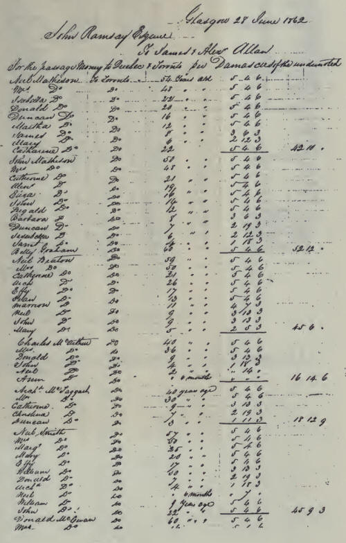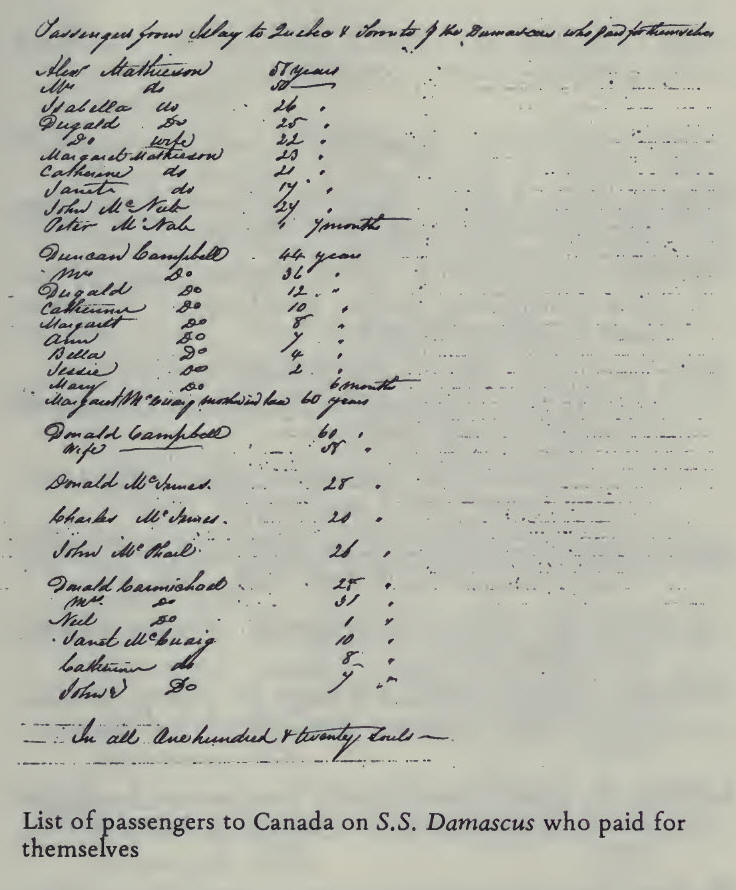 List showing the passengers on S.S. Damascus who had their fares to Canada paid by John Ramsay Esq.