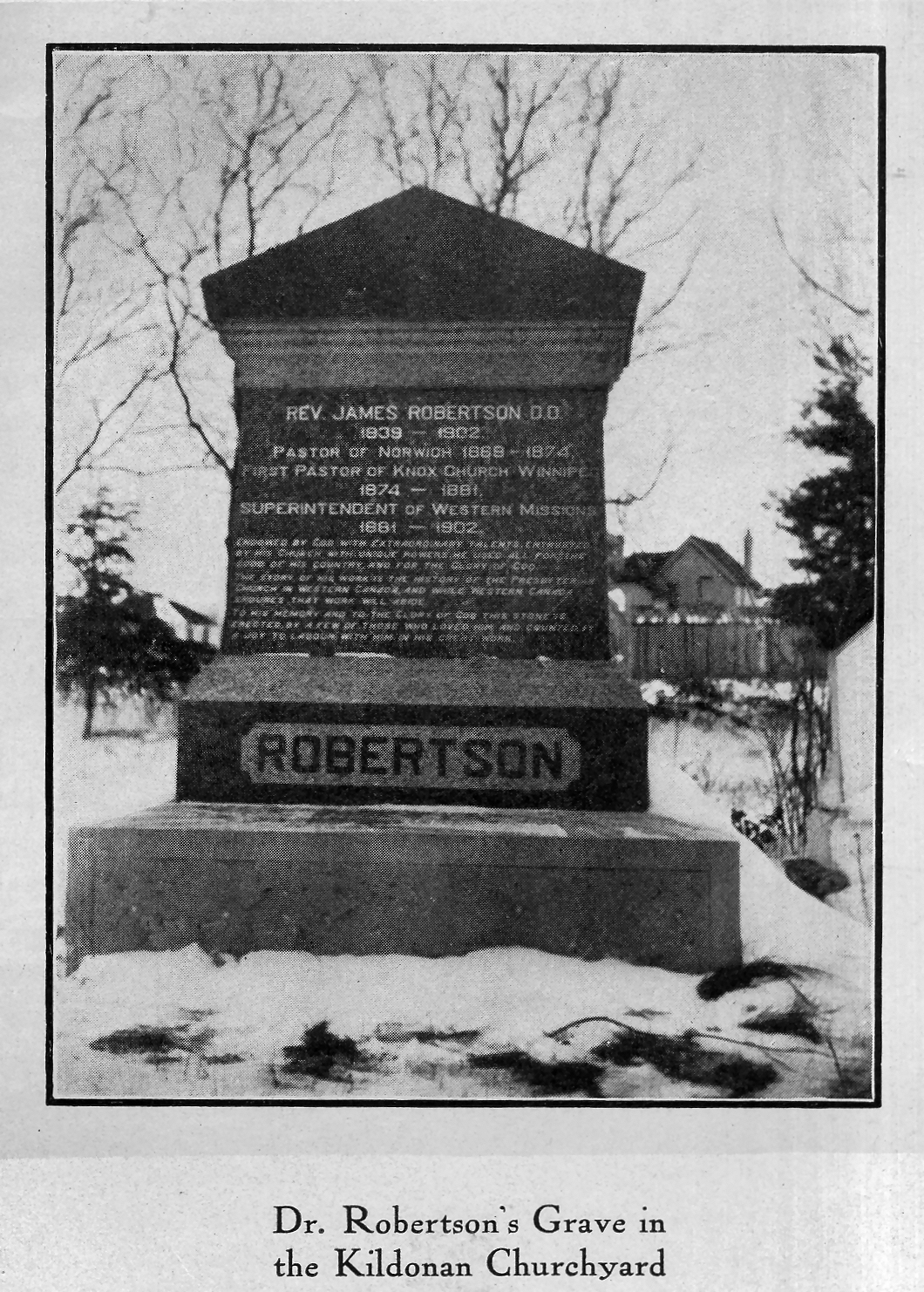 "Dr. Robertson was the founder of this Fund. He collected nearly all the money which constitutes its endowment, he recommended from his personal knowledge a very large number of the loans and grants which it made, he advocated the enlargement of the sphere of its operations so as to include, as it now does, British Columbia and a large portion of New Ontario, and in general his assistance was invaluable in administering its business because of the extent of his information, the sanity of his judgment and the depth of his interest in the work. The success of this Fund which has dotted the West with churches and manses will be an enduring monument of the enthusiasm, the strenuousness and the far ambition of Dr. Robertson’s life."