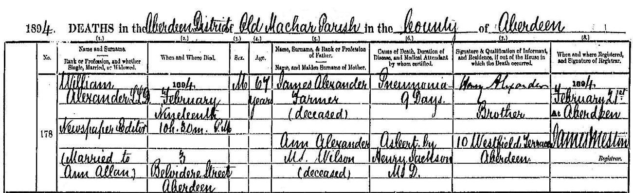 Alexander of 10 Westfield Terrace, Aberdeen. William was survived by his