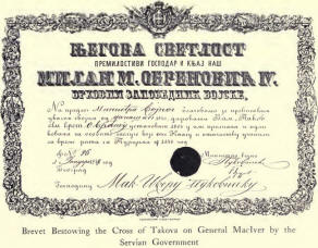 the Takovo Order from General Tchernaieff for gallant conduct in the