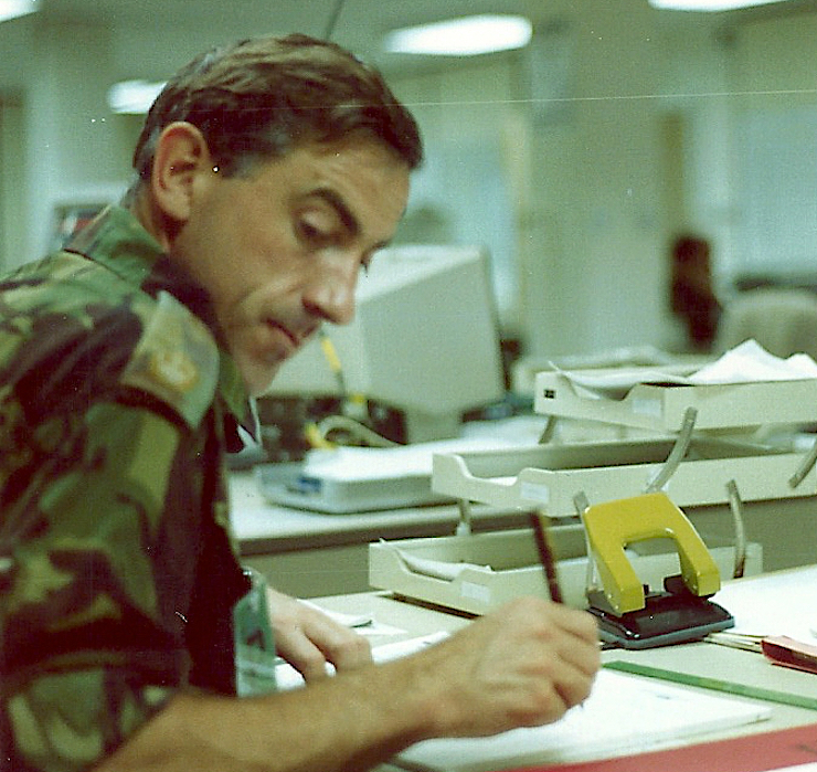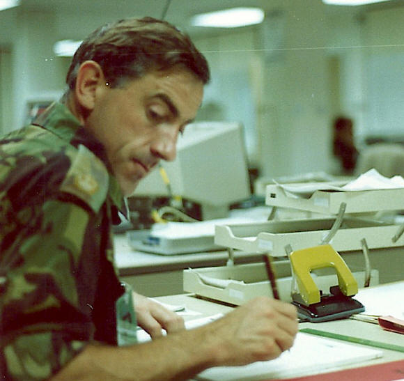 On 12th January 1991 we went on to 24 hour manning and I was designated to join the nightshift on the Land Cell operations desk. Things became noticeably more serious at this point; the Americans started wearing helmets and body armour and our guards from the Queen’s Own Highlanders became doubly vigilant. Worst news for many was that, there now being sufficient numbers in HQBFME, we now qualified for a catering unit and therefore subsistence allowances were to stop. As the unit’s gravy train arrived our own personal one came to an end.