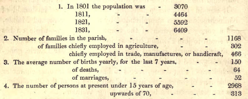 The increase of the population betwixt 1821 and 1831 may be accounted for by the facility with' which even boys engaged at weaving got possession of money; able to earn considerable wages before they had acquired sense to manage them, many hurried into matrimonial connections; and their wives being equally young and thoughtless, they indulged in dress and luxuries, and preserved no portion of their gains against poverty in less auspicious seasons.