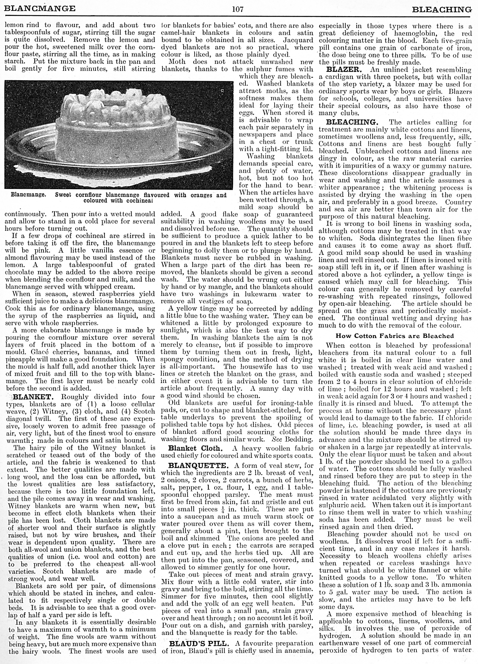 Blancmange, Blanket, Blanket Cloth, Blanquette, Blaud's Pill, Blazer, Bleaching