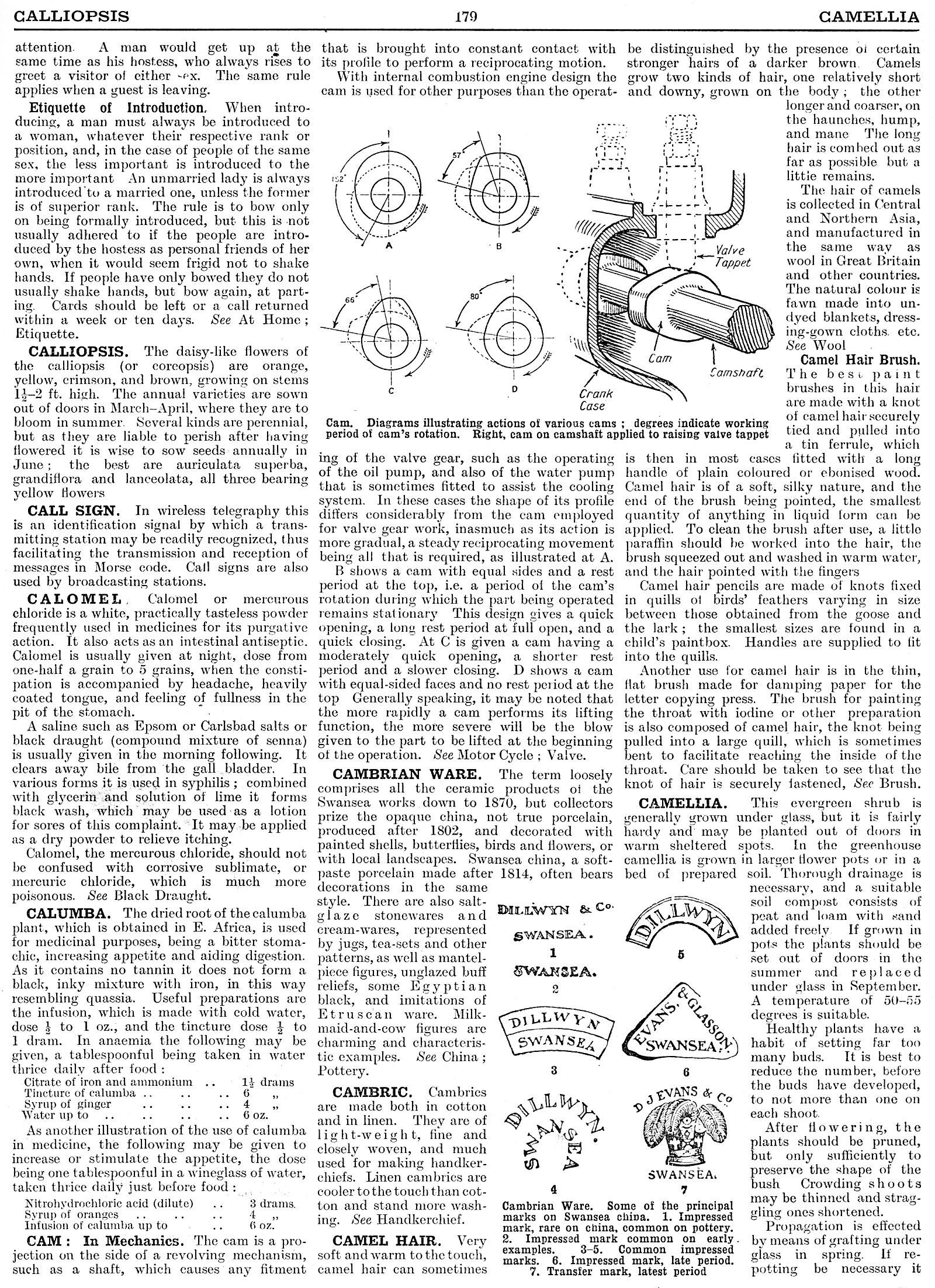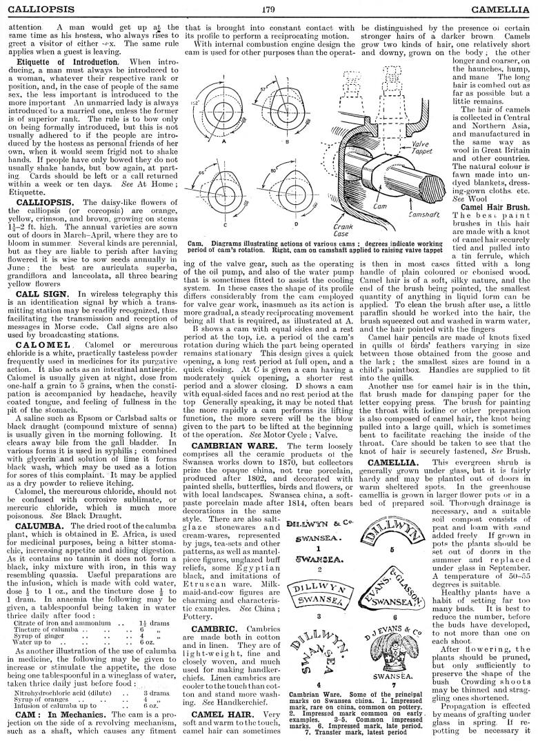 Calliopsis, Call Sign, Calomel, Calumba, Cam: In Mechanics, Cambrian Ware, Cambric, Camel Hair, Camellia