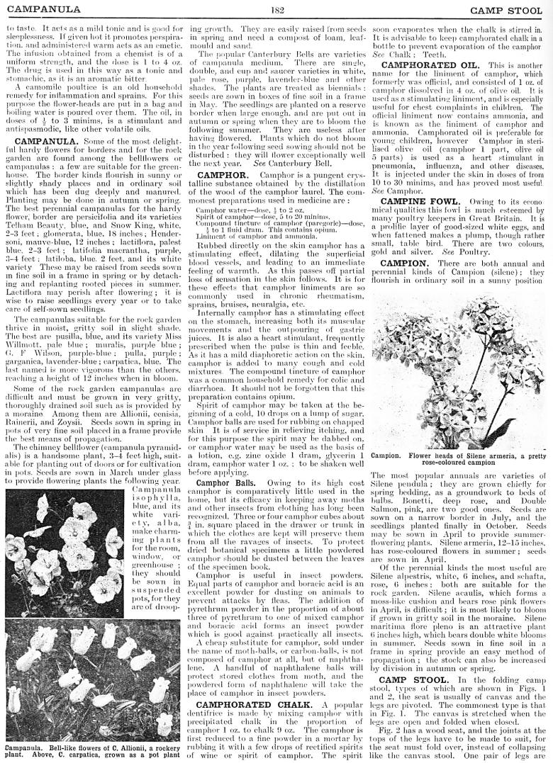Campanula, Camphor, Camphorated Chalk, Camphorated Oil, Campine Fowl, Campion, Camp Stool
