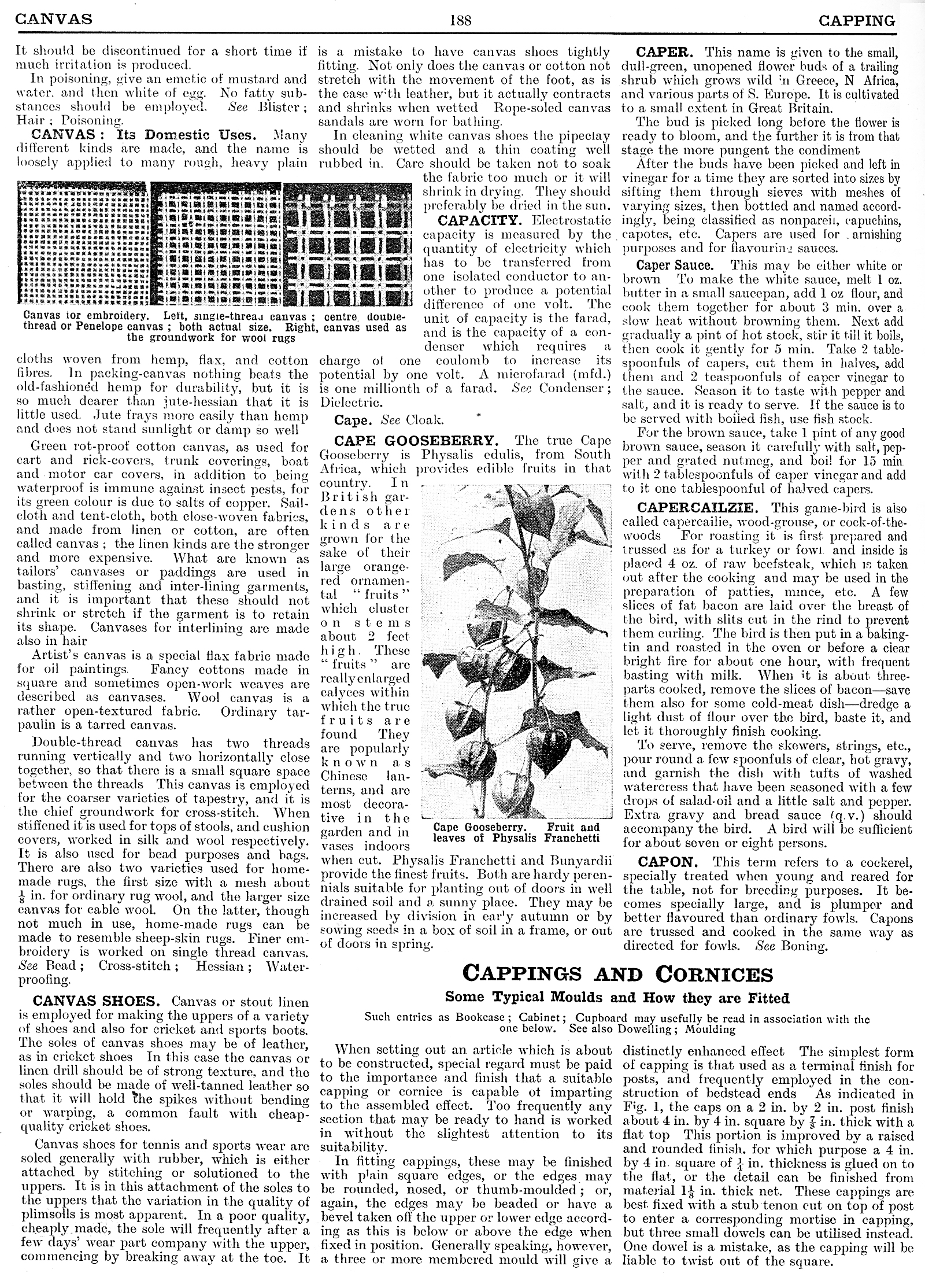 Canvas, Canvas Shoes, Capacity, Cape, Cape Gooseberry, Caper, Caper Sauce, Capercailzie, Capon, Cappings and Cornices