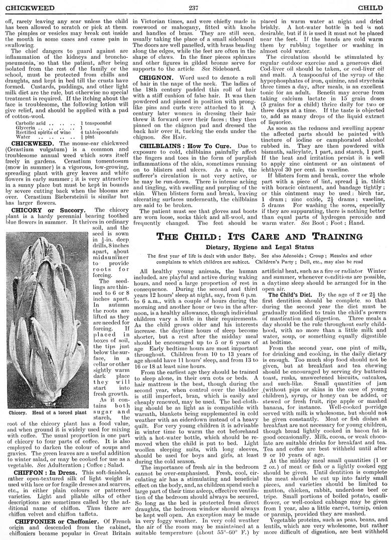 Chiffon, Chiffonier or Cheffonier, Chignon, Chilblaines, Child: Its Care