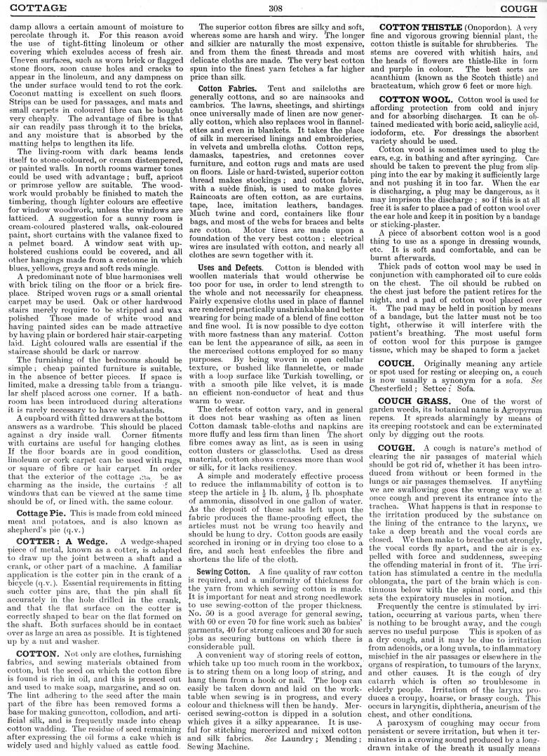 Cottage, Cottage Pie, Cotter, Cotton, Cotton Thistle, Cotton Wool, Couch, Couch Grass, Cough