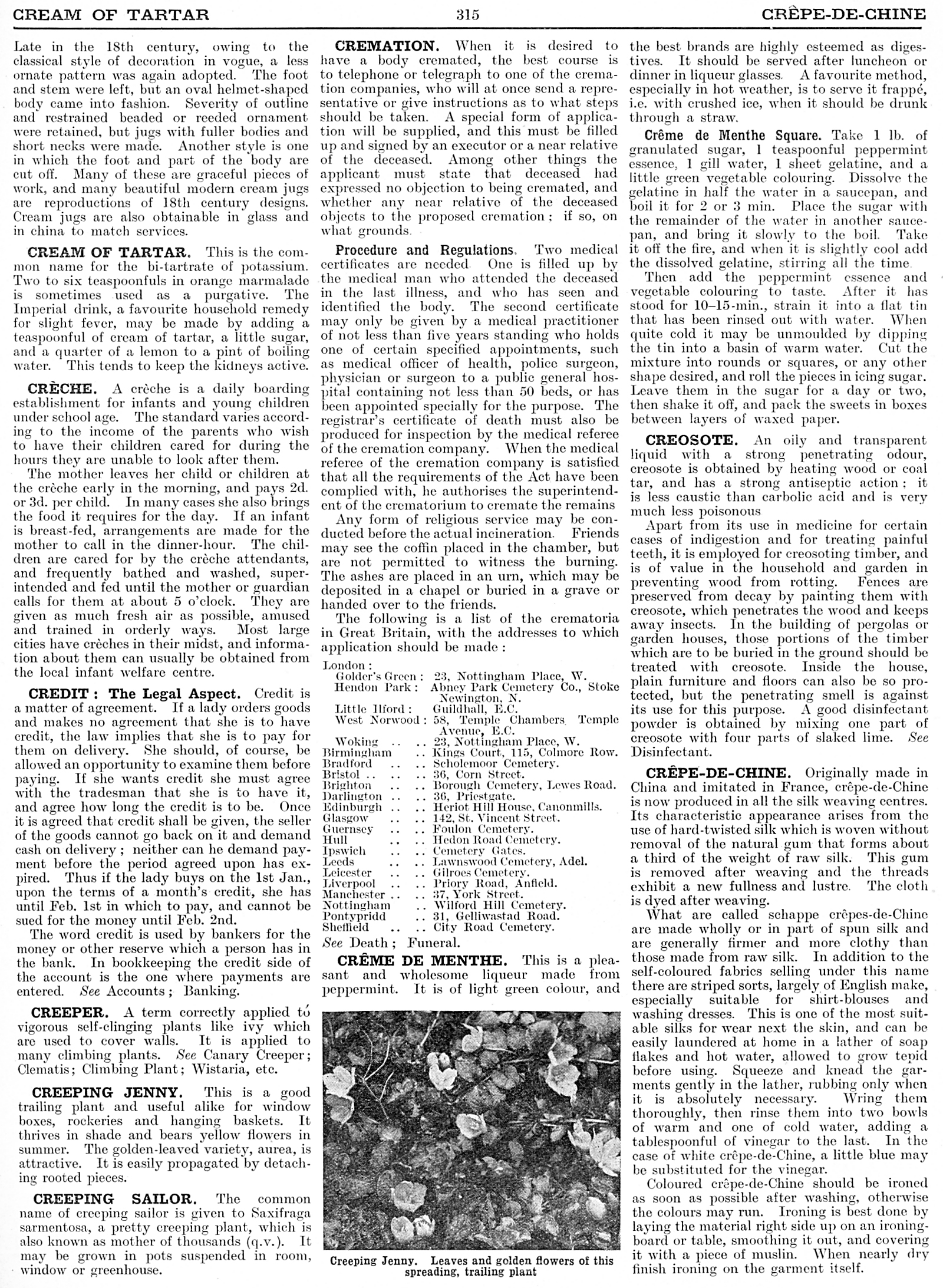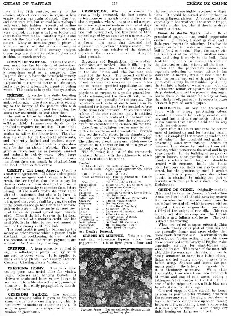Cream of Tartar, Creche, Credit, Creeper, Creeping Jenny, Creeping Sailor, Cremation, Creme de Menthe, Creosote, Crepe de Chine