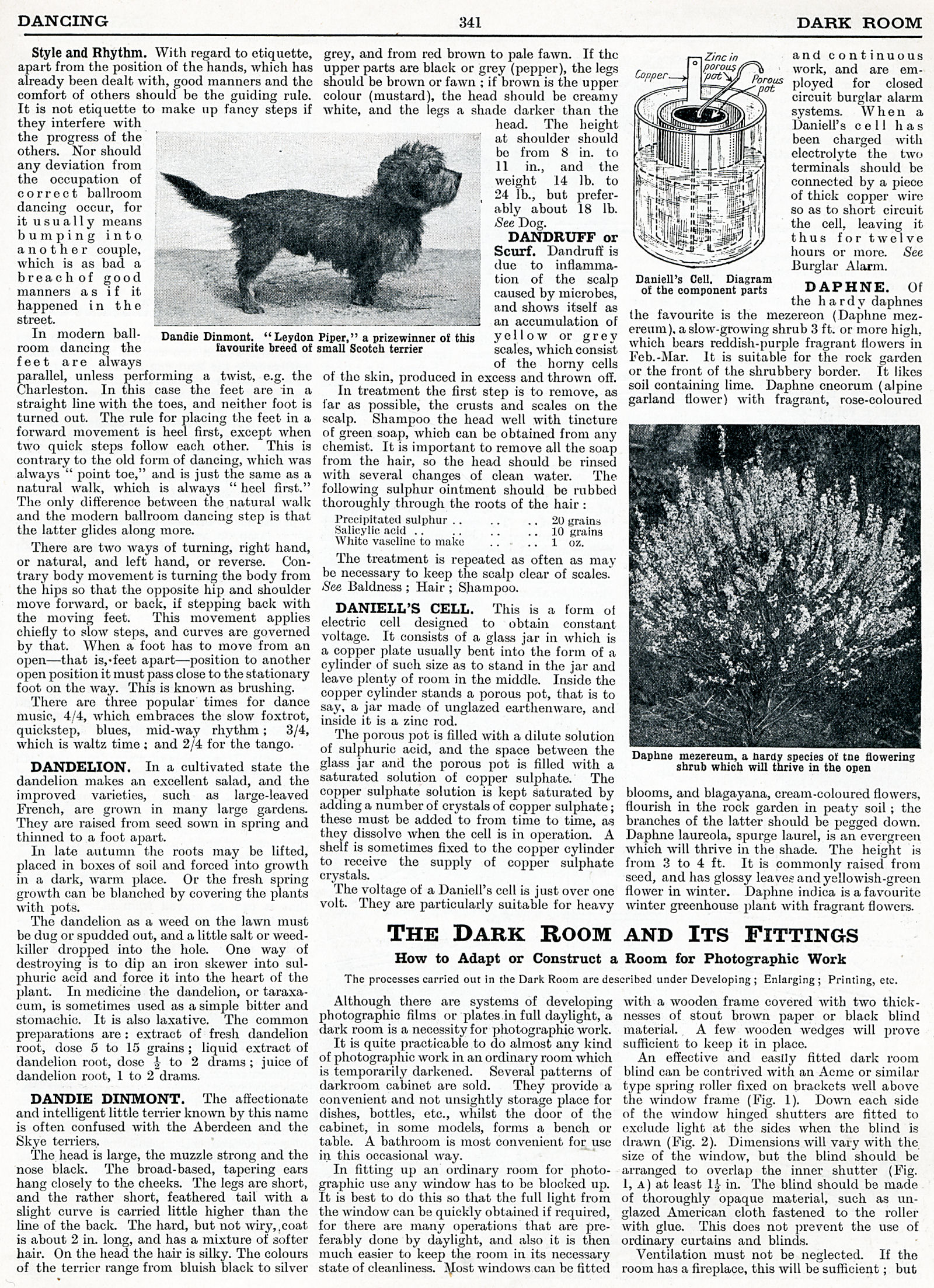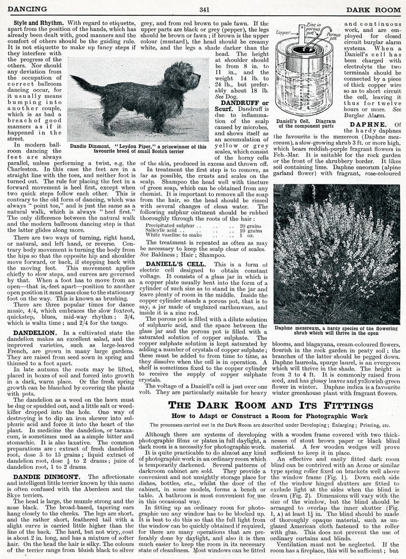 Dancing, Dandelion, Dandie Dinmont, Dandruff or Scurf, Daniell's Cell, Daphne, Dark Room