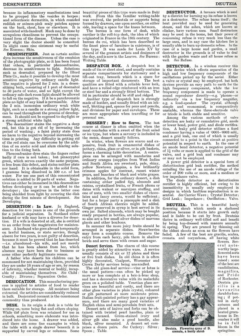 Desensitizer, Desertion, Desiccation, Desk, Despatch Box, Dessert, Destruction, Detector, Deutzia