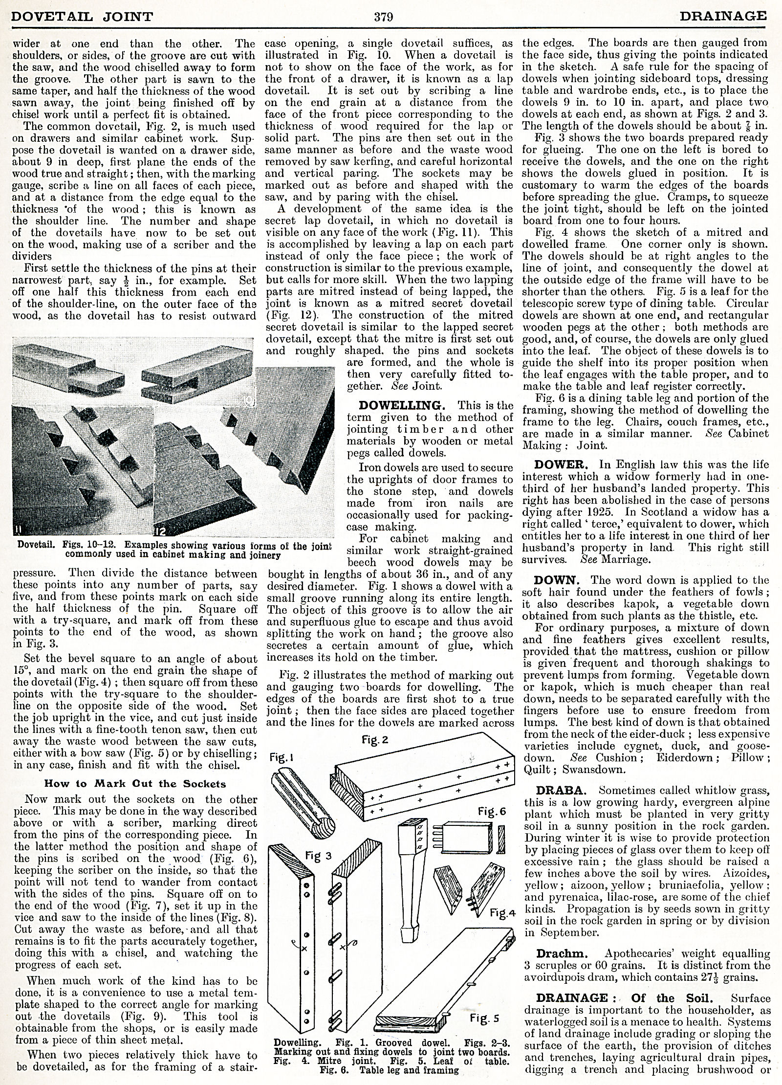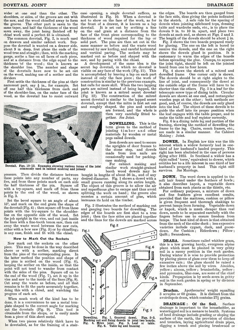 Dovetail Joint, Dowelling, Dower, Down, Draba, Drachm, Drainage