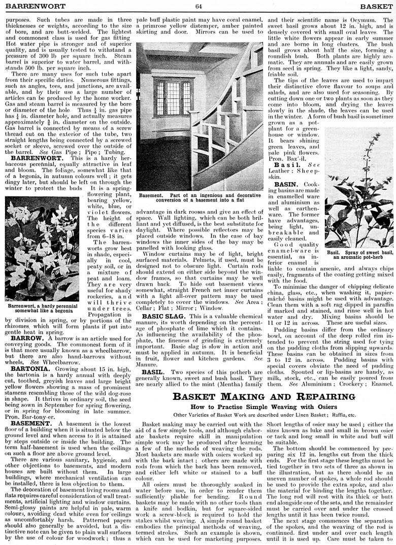 Barrenwort, Barrow, Bartonia, Basement, Basic Slag, Basil, Basin, Basket Making and Repairing