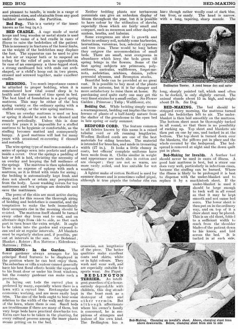 Bed Bug, Bed Cradle, Bedding, Bedding in the Garden, Bedding Out, Bedford Cord, Bedlington Terrier, Bed Making
