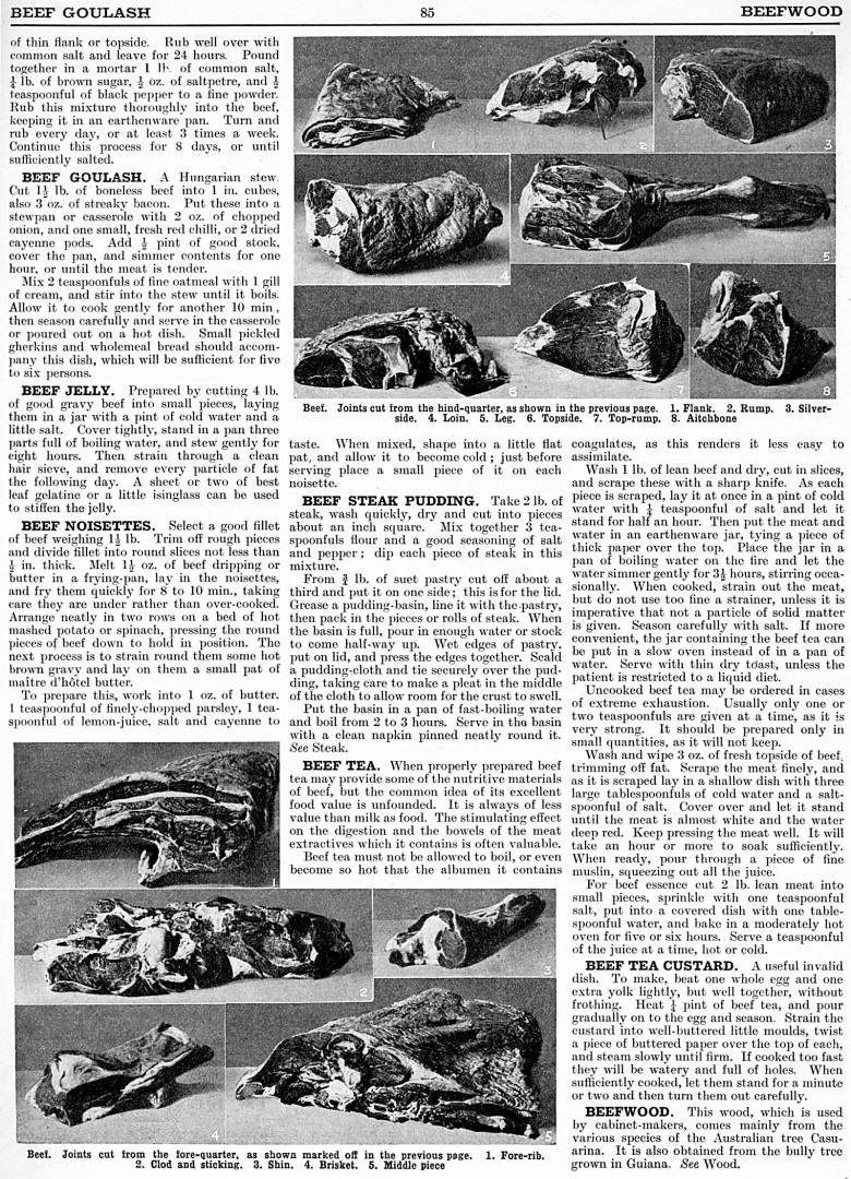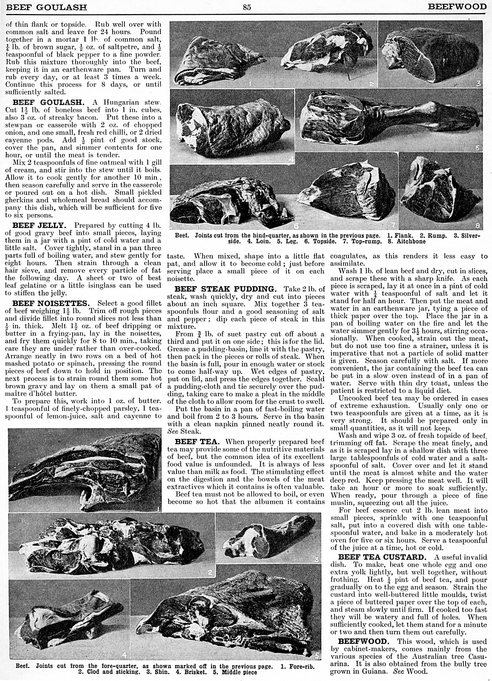 Beef Goulash, Beef Jelly, Beef Noisettes, Beef Steak Pudding, Beef Tea, Beef Tea Custard, Beefwood