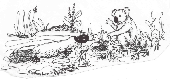 Percy platypus was swimming about in the billabong. "Hi Percy! I’m on a walkabout to find something different to eat. I’m tired of eucalyptus leaves. What do you eat?" she asked.