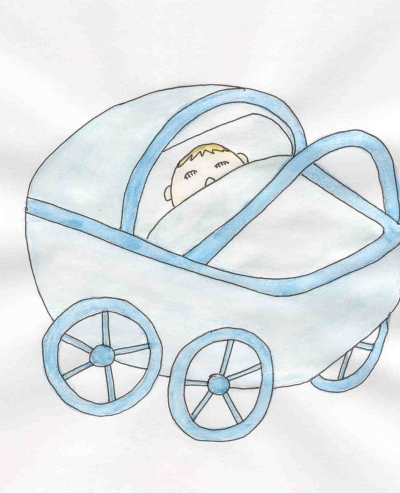Alban snuggly in his blue blanket and put him into his baby carriage. They