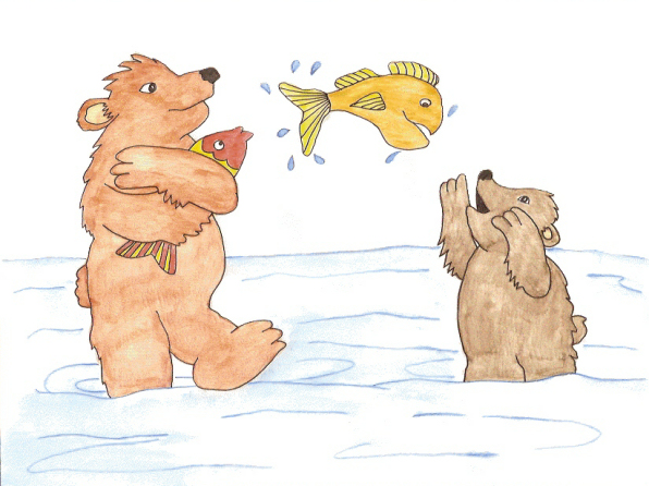 ran home. “Mama! Mama! I caught a fish this big.” He held his paws out