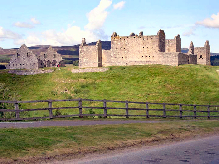 people at a pinch. On the right are the ruins of Ruthven Barracks -
