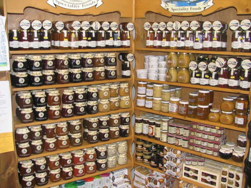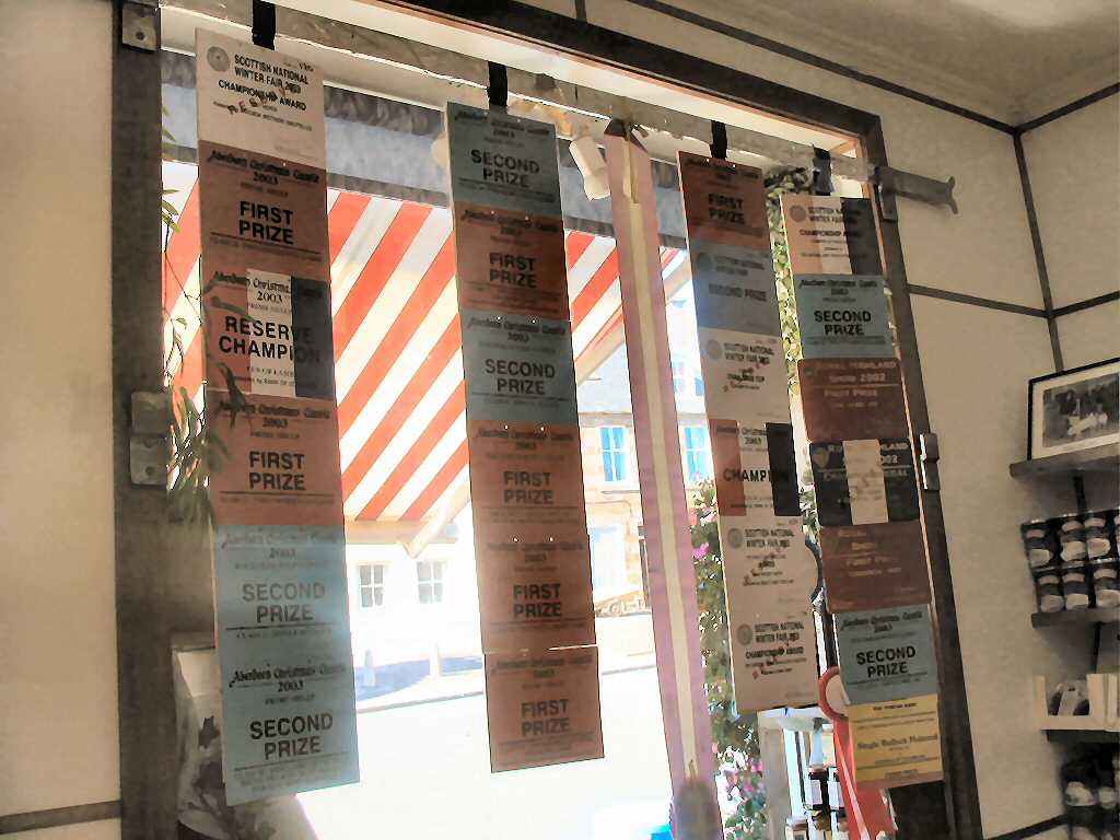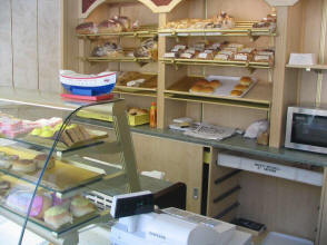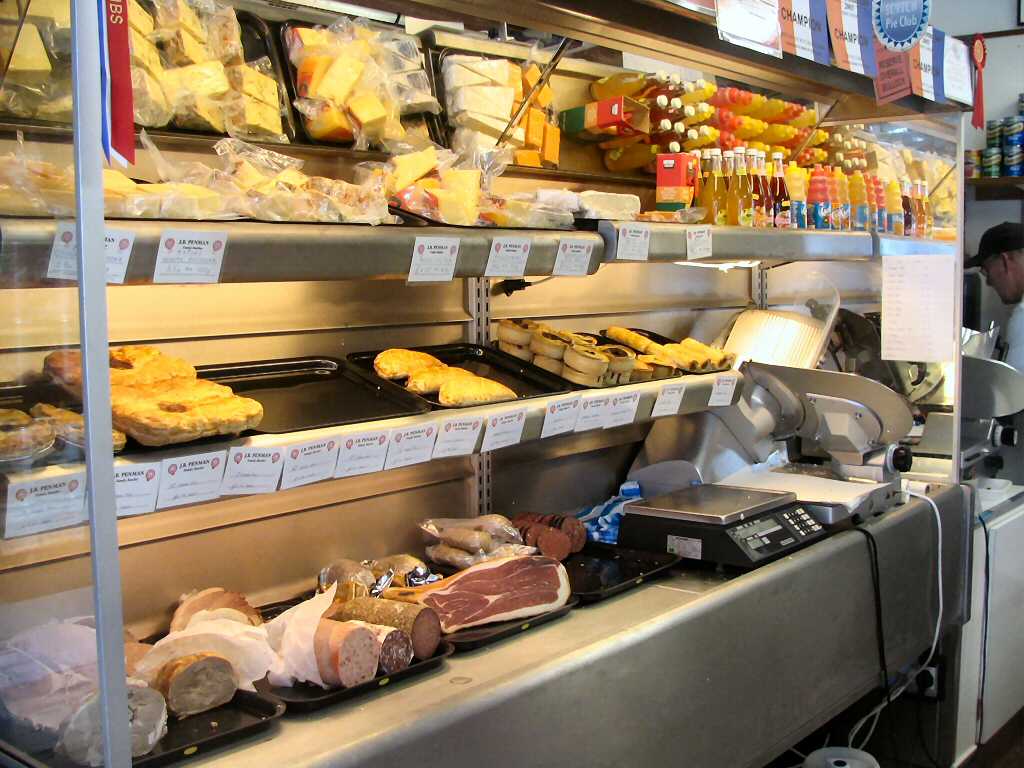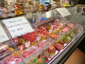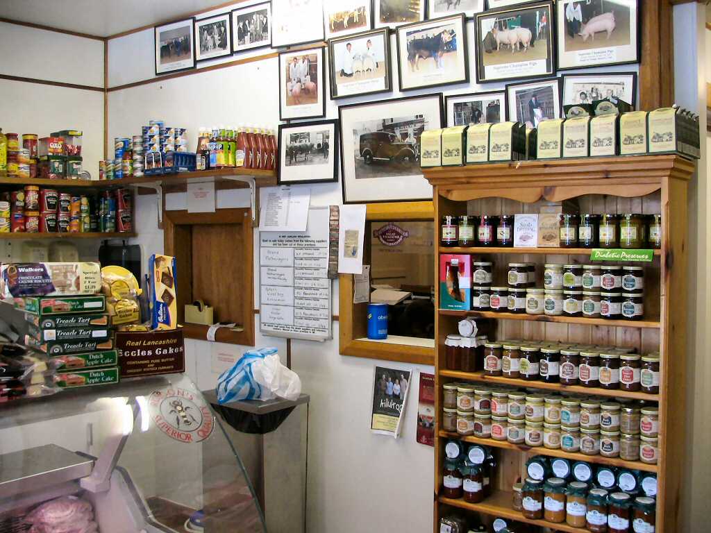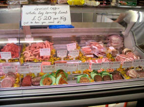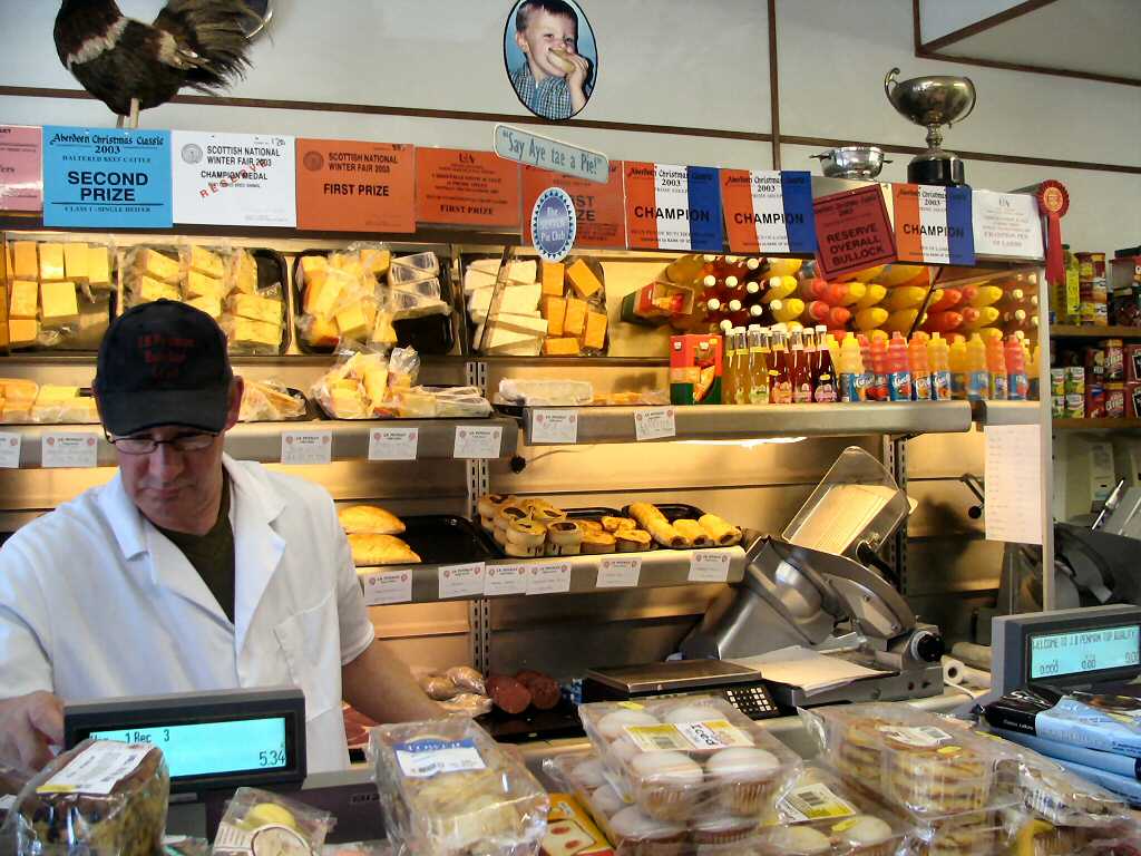 butcher with all the nice steak pies, bacon, black pudding, haggis and