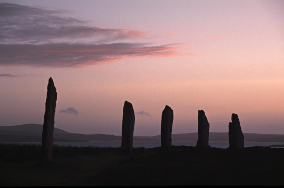 Returning to Kirkwall we found Cindy a little better having received antibiotics, and had a hearty meal. Anywhere else this would have been the end of the day, but here in the north the sky was still light as the cloud finally started to lift and break. We went off again heading for Orphir but the sight of an impending sunset (this after 10pm) as we neared Brodgar forced a change of mind and I was soon to be seen sprinting up to the Ring as the sun sank towards the distant horizon, determined to be in position for photographs. If we were all effected by our earlier visit then it was nothing compared to this one. Standing amongst these ancient stones at sunset is an experience that is never forgotten, and I consider myself incredibly privileged to have done it twice. Even long after the sun had gone the afterglow in the clouds threw pink and pewter reflections onto clouds and loch as we watched the swans, eider-ducks and myriad other birds on the water. Scanning with my binoculars I was fortunate to spot an owl quartering the fields in the twilight, a silent ghostly presence.