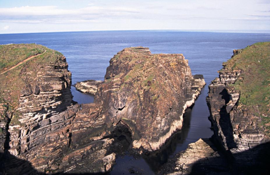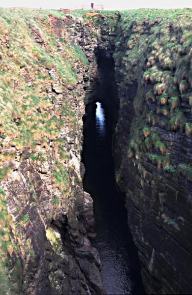 Still elated from what we'd seen we moved on to the nearby Yesnaby Cliffs. The car park is at an old WW2 gun emplacement but walk a few yards and you come to a spectacular series of cliffs and inlets which to the south give a fine view over to the even higher cliffs of Hoy with the Old Man outlined at their edge. A walk of only about half a mile in this direction is rewarding for the changing views as the waves roar and spill over the rocks while seabirds swoop overhead. It is a favourite spot for photographers and painters and you'll see lots of images in the