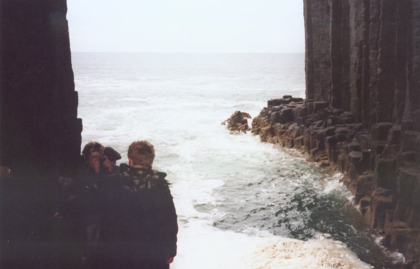 Your humble correspondent, with the entrace to Figal's Cave in the background. Inside Fingal's Cave, looking out. It was a gray and stormy day.