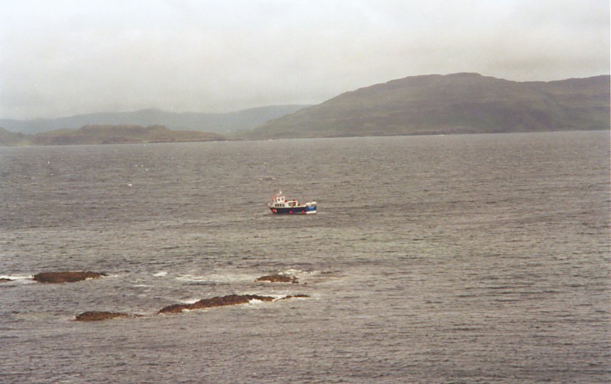 From atop Staffa Island, the launch that got us there. During the rocky voyage I kept repeating the sailor's prayer "Oh Lord, thy sea is so great, and my boat is so small." It must have worked.