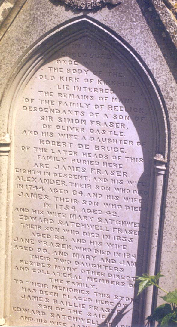 memorial stone erected by James Baillie Fraser at Kirkhill How many of us have not been tempted, at some point in our lives, to claim descent from a famous ancestor? However, what if you were descended from a famous ancestor, but picked the wrong one? That’s what happened when James Baillie Fraser of Reelig (1783-1856) had his ancestry carved in stone, and it may explain the confusion created by the heirs of his sister, Jane Anne Catherine Fraser of Reelig (1797-1881) who married Philip Affleck Fraser of Culduthel (1787-1862). The Fraser of Reelick entry in Burke’s Landed Gentry, 1886 edition (p. 709) attributed to their eldest son and heir, James Fraser of Reelig (1820-1888), as well as the entry in 1894 (p. 682) attributed to their grandson, Philip Affleck Fraser (1845-1918), follows:
